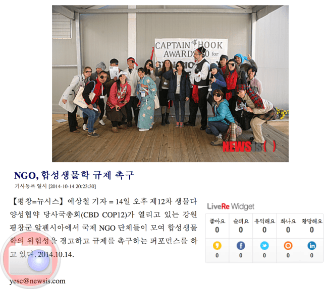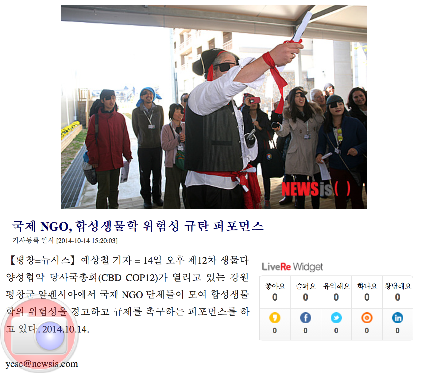 국제 NGO, 합성생물학 위험성 규탄 퍼포먼스 게시일: 2014년 10월 16일2021년 2월 25일 geykkorea 님이 작성 http://www.newsis.com/pict_detail/view.html?pict_id=NISI20141014_0010243304 http://www.newsis.com/pict_detail/view.html?pict_id=NISI20141014_0010242450 이 글 공유하기: 페이스북에 공유하려면 클릭하세요. (새 창에서 열림) Facebook 클릭하여 X에서 공유 (새 창에서 열림) X 인쇄하기 (새 창에서 열림) 인쇄 좋아하기 가져오는 중... 관련