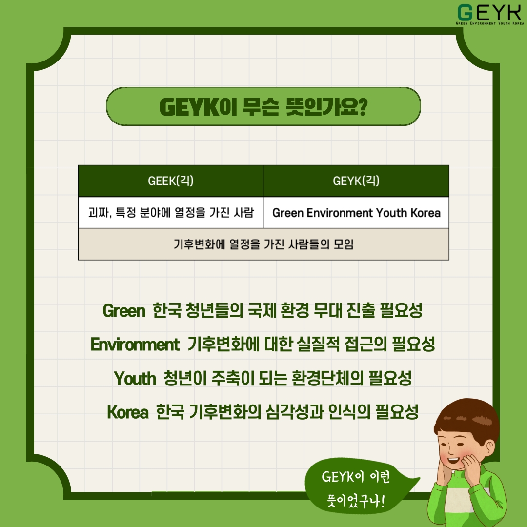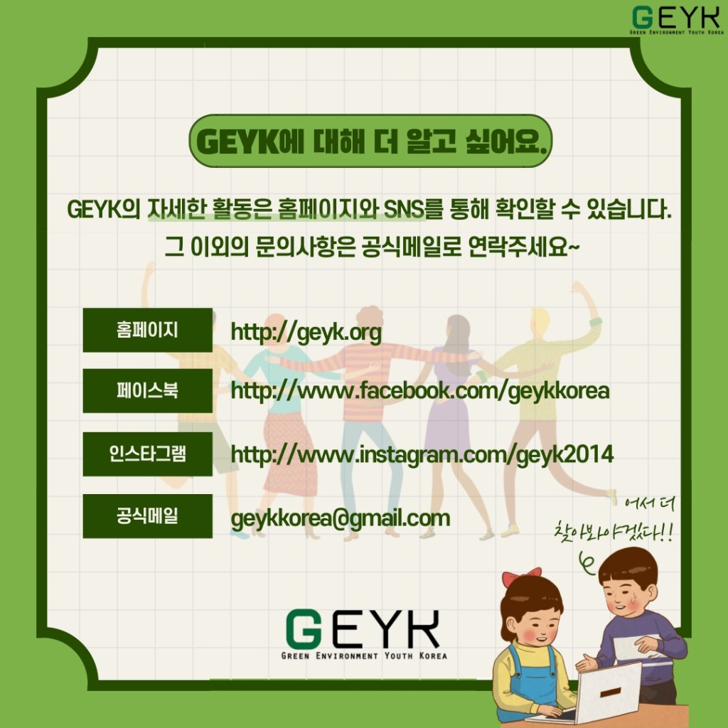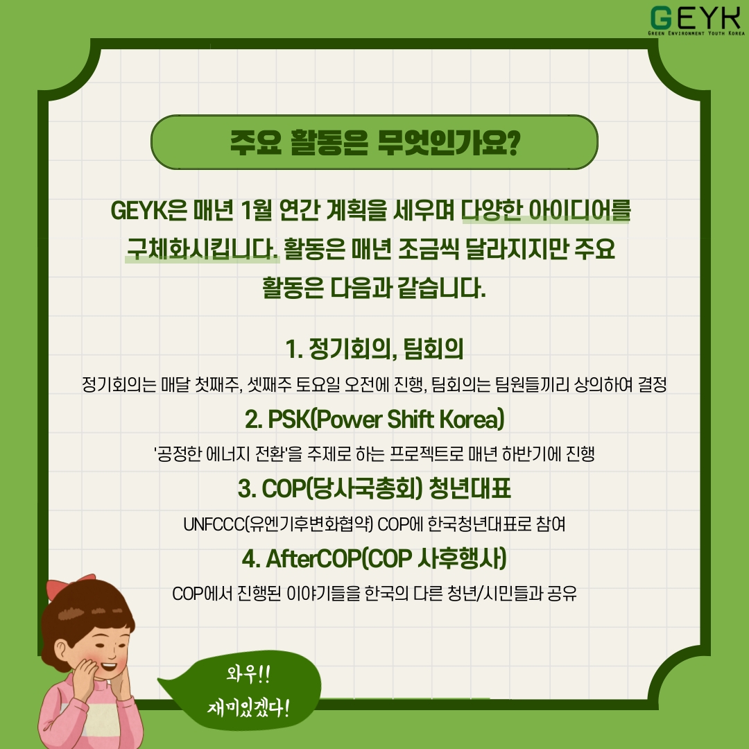 기후변화청년단체 GEYK에서는 해외 네트워크와의 협력을 통한 환경 행사 기획, 멤버들과 함께하는 스터디 참여, 지역사회와의 협업을 통한 로컬 프로젝트 기획, UNFCCC 당사국총회를 참관하고, GEYK의 유수한 멤버 풀을 통해 서로에게 많은 것을 배워갑니다.