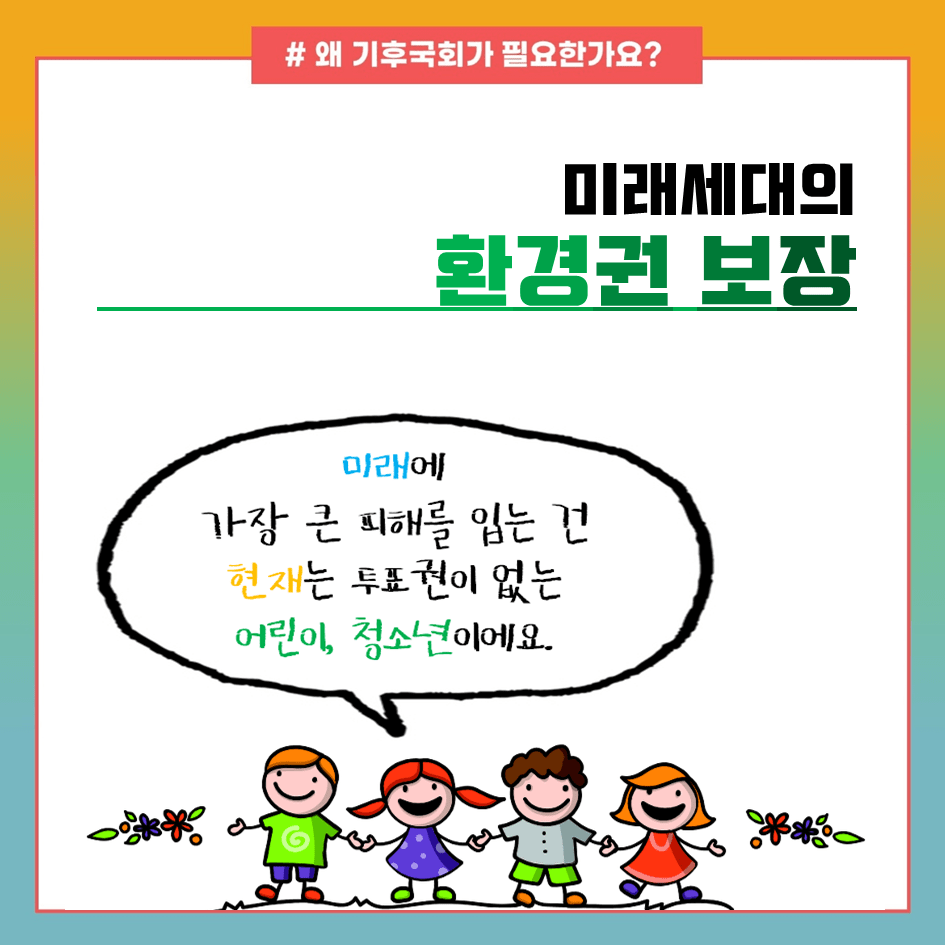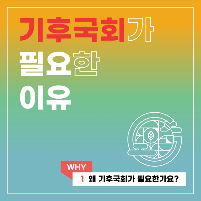 [WHY 시리즈] 기후국회가 필요한 이유 이번 총선에서 주목해야 할 키워드는 바로 ‘기후국회’ 였습니다. 기후국회가 무엇인지, 총선 이후 우리는 기후국회 구현을 위해 어떤 것들을 할 수 있을지 카드뉴스를 통해 한번쯤 생각해보셨으면 합니다! 그리고 오늘부터 매월 넷째 주 월요일엔 ‘WHY시리즈’를 업로드 할 예정입니다.