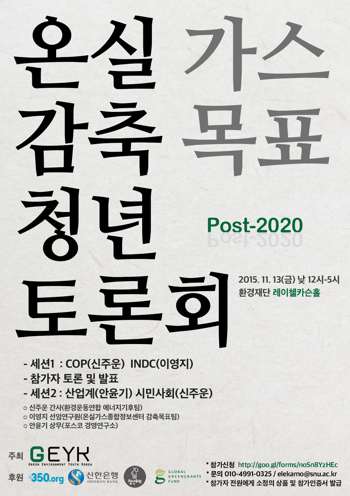 GEYK이 지난 11월 13일, Post-2020 온실가스 감축목표 청년토론회를 개최하였습니다. 청년토론회는 온실가스 감축목표 전문가들의 강연을 듣는 세션 1과 팀별 토론후 발표 뒤 산업계와 시민사회 대표분들의 의견을 듣는 세션 2로 구성되었습니다.
